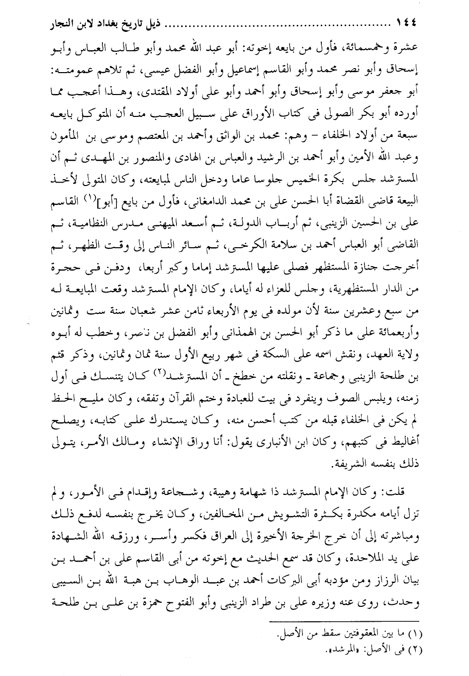 قلت: وكان الإمام المسترشد ذا شهامة وهيبة، وشجاعة وإقدام في الأمور، ولم تزل أيامه مكدرة بكثرة التشويش من المخالفين، وكان يخرج بنفسه لدفع ذلك ومباشرته إلى أن خرج الخرجة الأخيرة إلى العراق فكسر وأسر، ورزقه الله الشهادة على يد الملاحدة، وكان قد سمع الحديث مع إخوته من أبي القاسم علي بن أحمد بن بيان الرزاز ومن مؤدبه أبى البركات أحمد بن عبد الوهاب بن هبة الله بن السيبي وحدث، روى عنه وزيره على بن طراد الزينبي وأبو الفتوح حمزة بن على بن طلحة