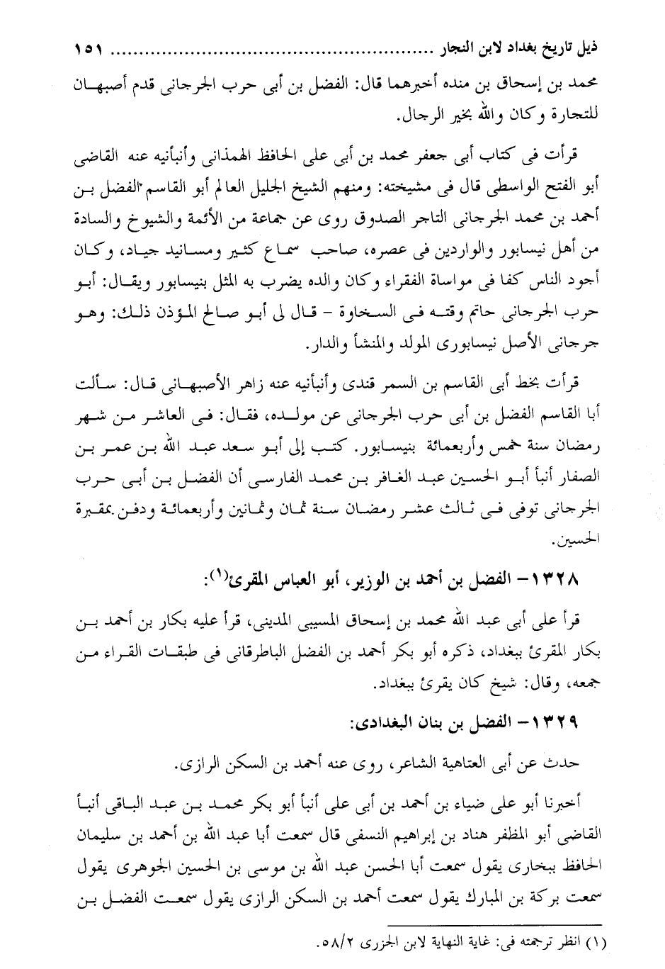قرأت في كتاب أبى جعفر محمد بن أبى على الحافظ الهمذاني وأنبأنيه عنه القاضي أبو الفتح الواسطي قال في مشيخته: ومنهم الشيخ الجليل العالم أبو القاسم الفضل بن أحمد بن محمد الجرجاني التاجر الصدوق روى عن جماعة من الأئمة والشيوخ والسادة من أهل نيسابور والواردين في عصره، صاحب سماع كثير ومسانيد جياد، وكان أجود الناس كفا في مواساة الفقراء وكان والده يضرب به المثل بنيسابور ويقال: أبو حرب الجرجاني حاتم وقته في السخاوة- قال لي أبو صالح المؤذن ذلك: وهو جرجانى الأصل نيسابورى المولد والمنشأ والدار.