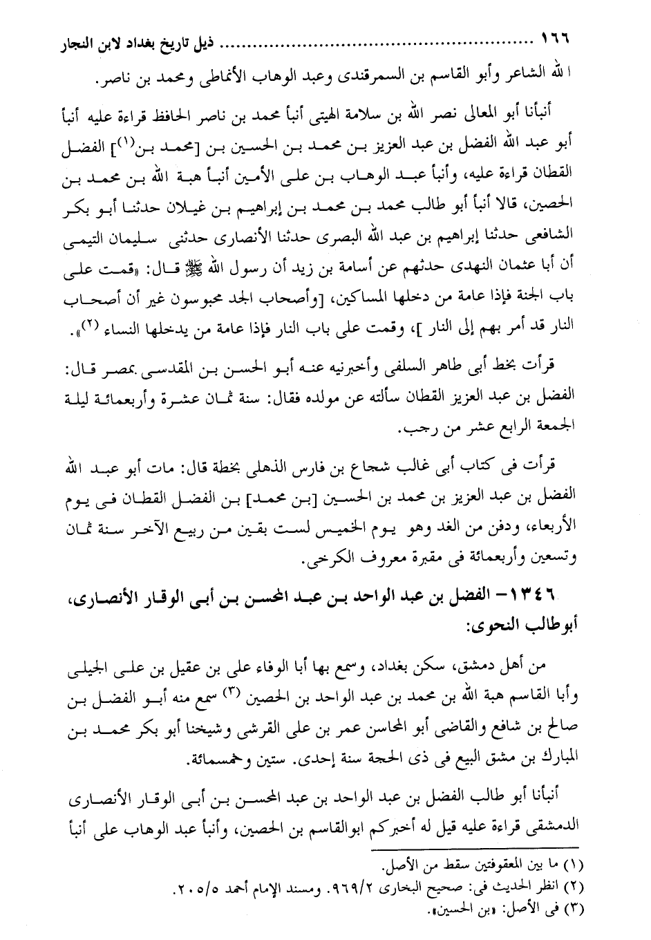أنبأنا أبو المعالي نصر الله بن سلامة الهيتي أنبأ محمد بن ناصر الحافظ قراءة عليه أنبأ أبو عبد الله الفضل بن عبد العزيز بْن مُحَمَّد بْن الْحُسَيْنِ بْن [مُحَمَّد بْن [1]] الْفَضْلِ القطان قراءة عَلَيْهِ، وَأَنْبَأَ عَبْدُ الْوَهَّابِ بْنُ عَلِيٍّ الأَمِينُ أنبأ هبة أنبأ بْنُ مُحَمَّدِ بْنِ الْحُصَيْنِ، قَالا أَنْبَأَ أَبُو طَالِبٍ مُحَمَّدُ بْنُ مُحَمَّدِ بْنِ إِبْرَاهِيمَ بْنِ غَيْلانَ حدثنا أبو بكر الشافعي حدثنا إبراهيم بن عبد الله البصري حدثنا الأنصارىّ حدثني سليمان التَّيْمِيَّ أَنَّ أَبَا عُثْمَانَ النَّهْدِيَّ حَدَّثَهُمْ عَنْ أُسَامَةَ بْنِ زَيْدٍ أَنَّ رَسُولَ اللَّهِ صَلَّى اللَّهُ عَلَيْهِ وَسَلَّمَ قَالَ: «قُمْتُ عَلَى بَابِ الْجَنَّةِ فَإِذَا عَامَّةُ من دخلها المساكين، [وأصحاب الجد محبوسون غير أن أصحاب النار قد أمر بهم إلى النار] ، وَقُمْتُ عَلَى بَابِ النَّارِ فَإِذَا عَامَّةُ مَنْ يدخلها النساء [2] » .