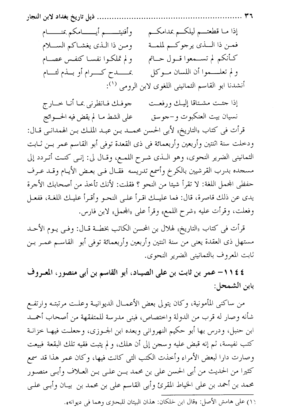 ودخلت سنة اثنتين وأربعين وأربعمائة في ذى القعدة توفى أبو القاسم عمر بن ثابت الثمانيني الضرير النحوي، وهو الذي شرح اللمع، وقال لي: إنى كنت أتردد إلى مسجده بدرب القرشيين بالكرخ وأسمع تدريسه فقال في بعض الأيام وقد عرف حفظي المجمل اللغة: لا تقرأ شيئا من النحو؟ فقلت: لأنك تأخذ من أصحابك الأجرة يدي عن ذلك قاصرة، قال: فما عليك اقرأ على النحو وأقرأ عليك اللغة، ففعل وفعلت، وقرأت عليه «شرح اللمع» وقرأ على «المجمل» لابن فارس.
