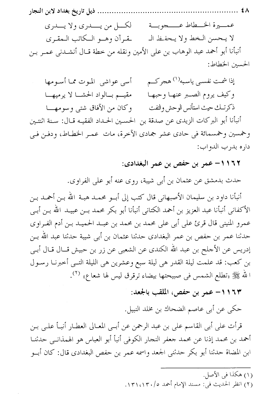 قرأت عَلَى أبي القاسم علي بن عبد الرحمن عن أبى المعالي العطار أنبأ على بن أحمد بن محمد إذنا عن محمد جعفر النجار الكوفي أنبأ أبو العباس هو الهمذاني حدثنا ابن المضاة حدثنا أبو بكر حدثني الجعد واسمه عمر بن حفص البغدادي قال: كان أبو