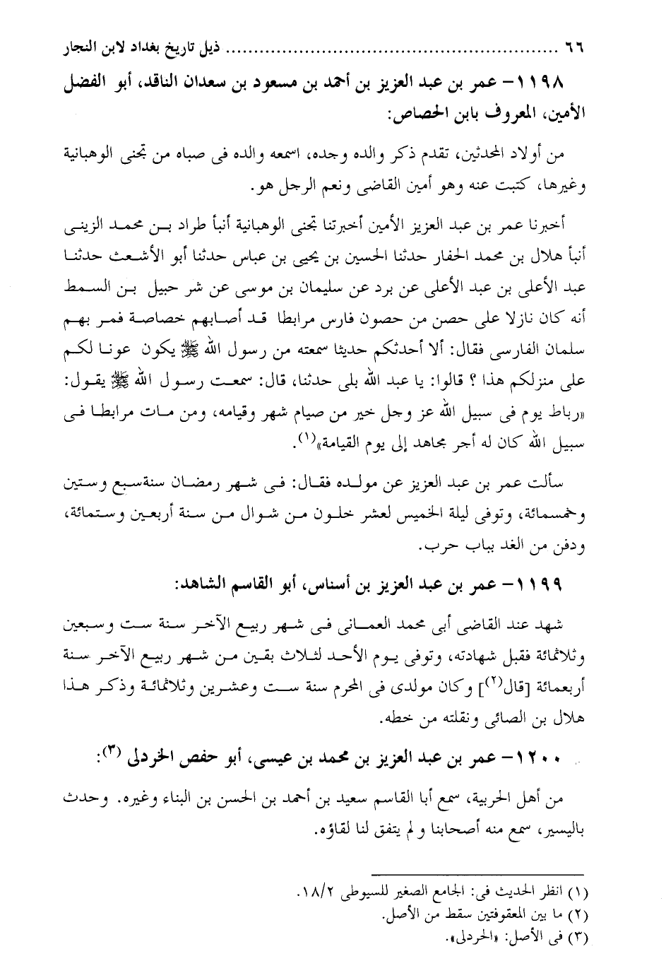 1198- عمر بن عَبْد العزيز بْن أَحْمَد بْن مَسْعُود بْن سعدان الناقد، أبو الفضل الأمين، المعروف بابن الحصاص: