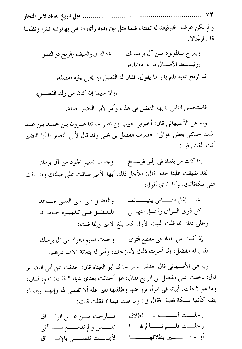 وبه عن الأصبهانى قال: أخبرنى حبيب بن نصر حدثنا هرون بن محمد بن عبد الملك حدثني بعض الموالي: حضرت الفضل بن يحيى وقد قال لأبى النضير يا أبا النضير أنت القائل فينا: