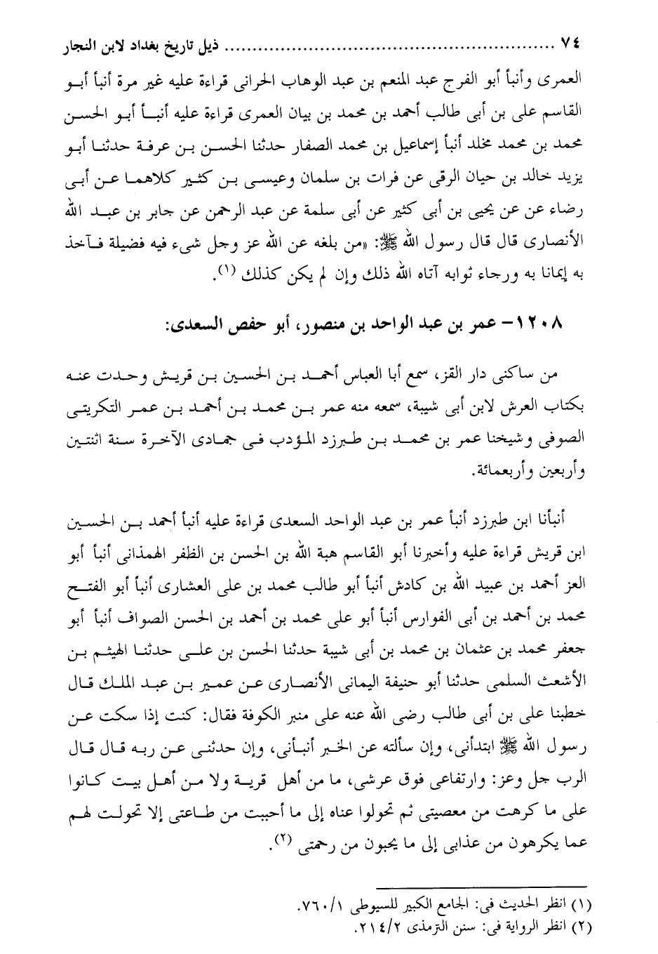 العمرى وَأَنْبَأَ أَبُو الْفَرَجِ عَبْدُ الْمُنْعِمِ بْنُ عَبْدِ الوهاب الحراني قراءة عليه غَيْرَ مَرَّةٍ أَنْبَأَ أَبُو الْقَاسِمِ عَلِيُّ بْنُ أبى طالب أحمد بن محمد بن بيان العمرى قِرَاءَةً عَلَيْهِ أَنْبَأَ أَبُو الْحَسَنِ مُحَمَّدُ بْنُ محمد مخلد أنبأ إسماعيل بن محمد الصفار حدثنا الحسن بن عرفة حدثنا أبو يزيد خالد بن حيان الرقى عَنْ فُرَاتِ بْنِ سَلْمَانَ وَعِيسَى بْنِ كَثِيرٍ كلاهما عن أبى رضاء عن عَنْ يَحْيَى بْنِ أَبِي كَثِيرٍ عَنْ أَبِي سلمة عن عَبْدِ الرَّحْمَنِ عَنْ جَابِرِ بْنِ عَبْدِ اللَّهِ الأَنْصَارِيِّ قَالَ قَالَ رَسُولُ اللَّهِ صَلَّى اللَّهُ عَلَيْهِ وسلم: «من بلغه عن الله عز وجل شَيْءٌ فِيهِ فَضِيلَةٌ فَأَخَذَ بِهِ إِيمَانًا بِهِ ورجاء ثوابه آتاه الله ذلك وإن لم يكن كذلك [1] .