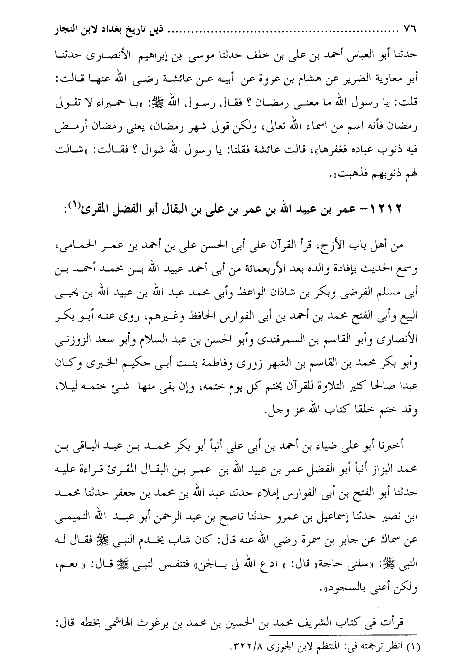 1212- عمر بْن عُبَيْد اللَّه بْن عمر بْن علي بن البقال أبو الفضل المقرئ [1] :