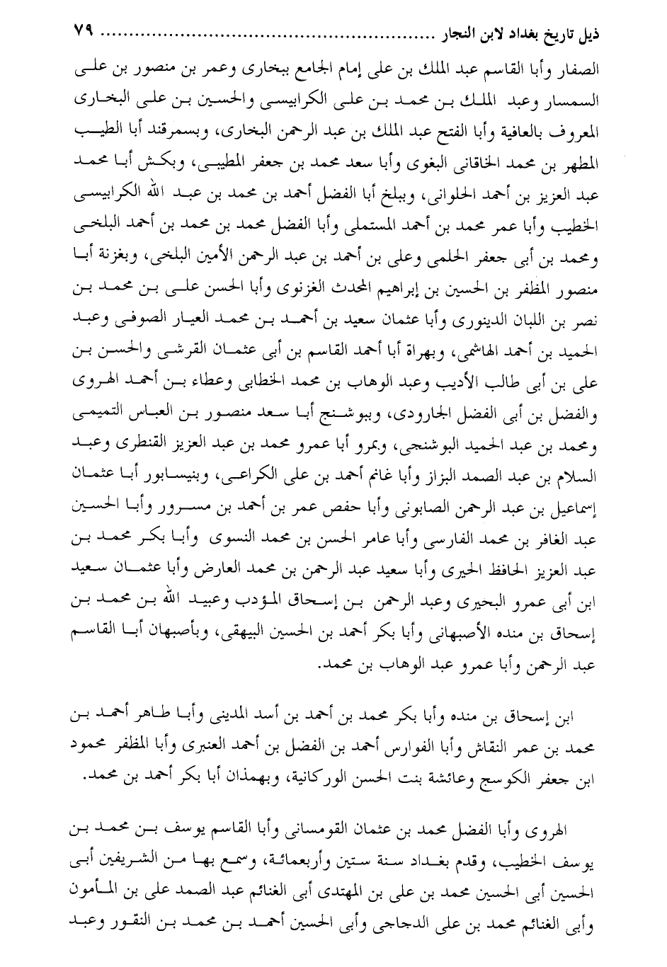 الصفار وأبا القاسم عبد الملك بن على إمام الجامع ببخارى وعمر بن منصور بن على السمسار وعبد الملك بن محمد بن على الكرابيسي والحسين بن على البخاري المعروف بالعافية وأبا الفتح عبد الملك بن عبد الرحمن البخاري، وبسمرقند أبا الطيب المطهر بن محمد الخاقاني البغوي وأبا سعد محمد بن جعفر المطيبى، وبكش أبا محمد عبد العزيز بن أحمد الحلواني، وببلخ أبا الفضل أَحْمَد بْن مُحَمَّد بْن عَبْد اللَّه الكرابيسي الخطيب وأبا عمر محمد بن أحمد المستملي وأبا الفضل محمد بن محمد بن أحمد البلخي ومحمد بن أبى جعفر الحلمى وعلى بن أحمد بن عبد الرحمن الأمين البلخي، وبغزنة أبا منصور المظفر بن الحسين بن إبراهيم المحدث الغزنوي وأبا الحسن على بن محمد بن نصر بن اللبان الدينوري وأبا عثمان سعيد بن أحمد بن محمد العيار الصوفي وعبد الحميد بن أحمد الهاشمي، وبهراة أبا أحمد القاسم بن أبى عثمان القرشي والحسن بن على بن أبى طالب الأديب وعبد الوهاب بن محمد الخطابي وعطاء بن أحمد الهروي والفضل بن أبى الفضل الجارودي، وببوشنج أبا سعد منصور بن العباس التميمي ومحمد بن عبد الحميد البوشنجي، وبمرو أبا عمرو محمد بن عبد العزيز القنطري وعبد السلام بن عبد الصمد البزاز وأبا غانم أحمد بن على الكراعى، وبنيسابور أبا عثمان إسماعيل بْن عبد الرحمن الصابوني وأبا حفص عمر بن أحمد بن مسرور وأبا الحسين عبد الغافر بن محمد الفارسي وأبا عامر الحسن بن محمد النسوى وأبا بكر محمد بن عبد العزيز الحافظ الحيرى وأبا سعيد عبد الرحمن بن محمد العارض وأبا عثمان سعيد ابن أبى عمرو البحيري وعبد الرحمن بن إسحاق المؤدب وعُبَيْد اللَّهِ بن مُحَمَّدِ بْنِ إِسْحَاق بن مندة الأصبهانى وأبا بكر أحمد بن الحسين البيهقي، وبأصبهان أبا القاسم عبد الرحمن وأبا عمرو عبد الوهاب بن محمد.