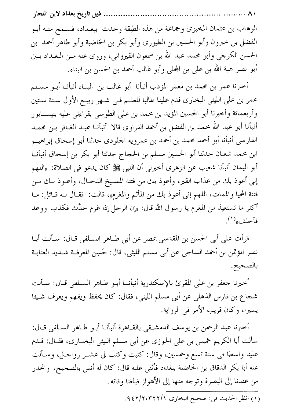 أخبرنا عمر بن محمد بن معمر المؤدب أنبأنا أبو غالب بن البناء أنبأنا أبو مسلم عمر بن على الليثي البخاري قدم علينا طالبا للعلم في شهر ربيع الأول سنة ستين وأربعمائة وأخبرنا أبو الحسين المؤيد بن محمد بن على الطوسي بقراءتي عليه بنيسابور أنبأنا أَبُو عَبْد اللَّه مُحَمَّد بْن الفضل بْن أحمد الفراوي قالا أنبأنا عبد الغافر بن محمد الفارسي أنبأنا أبو أحمد محمد بن أحمد بن عمرويه الجلودي حدثنا أبو إسحاق إبراهيم ابن محمد شعبان حدثنا أبو الحسين مسلم بن الحجاج حدثنا أبو بكر بن إسحاق أنبأنا أبو اليمان أنبأنا شعيب عن الزهري أخبرنى أَنَّ النَّبِيَّ صَلَّى اللَّهُ عَلَيْهِ وَسَلَّمَ كَانَ يدعو في الصلاة: «اللهم إنى أعوذ بك من عذاب القبر، وأعوذ بك من فتنة المسيخ الدجال، وأعوذ بك من فتنة المحيا والممات، اللهم إنى أعوذ بك من المأثم والمغرم» ، قالت: فقال له قَائِلٌ: مَا أَكْثَرَ مَا تَسْتَعِيذُ مِنَ الْمَغْرَمِ يا رسول الله قال: «إِنَّ الرَّجُلَ إِذَا غَرِمَ حَدَّثَ فَكَذَبَ وَوَعَدَ فأخلف» [1] .