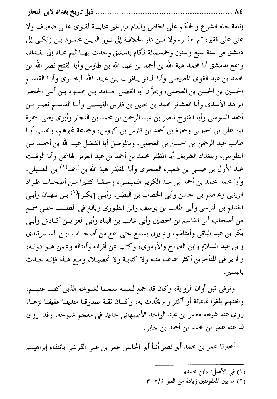 إقامة جاه الشرع والحكم على الخاص والعام من غير محاباة لقوى على ضعيف ولا غنى على فقير، ثم نفذ رسولا من دار الخلافة إلى نور الدين محمود بن زنكي إلى دمشق في سنة سبع وستين وخمسمائة فأقام بدمشق وحدث بها ثم عاد إلى بغداد، وسمع بدمشق أبا مُحَمَّد هبة اللَّه بْن أَحْمَد بْن عَبْد اللَّه بْن طاوس وأبا الفتح نصر الله بن مُحَمَّد بن عبد القوى المصيصي وأبا الدر ياقوت بن عبد الله البخاري وأبا القاسم الحسين بن الحسن بن العجمي، وبحرّان أبا الفضل حامد بن محمود بن أبى الحجر الزاهد الأسدى وأبا العشائر محمد بن خليل بن فارس القيسي وأبا القاسم نصر بن أحمد السوسي وأبا الفتوح ناصر بن عبد الرحمن بن محمد بن النجار وأبوى يعلى حمزة ابن على بن الحبوبى وحمزة بن أحمد بن فارس بن كروس، وجماعة غيرهم، وبحلب أبا طالب عبد الرحمن بن الحسن بن العجمي، وبالموصل أبا الفضل عبد الله بن أحمد بن الطوسي، وببغداد الشريف أبا المظفر مُحَمَّد بْن أَحْمَد بْن عَبْد العزيز الهاشمي وأبا الوقت عبد الأول بن عيسى بن شعيب السجزي وأبا المظفر هبة اللَّه بن أحمد [1] بن الشبلي، وأبا محمد محمد بن أحمد بن عبد الكريم التميمي، وخلقًا كثيرًا من أصحاب طراد الزينبي وعاصم بن الحسن وأبى الخطاب بن البطر، وأبى [بكر] [2] بن نبهان وأبى الغنائم بن النرسي وأبى طالب بن يوسف وابن الطيوري وبالغ في الطلب حتى سمع من أصحاب أبي القاسم بْن الحصين وأبي غالب بْن البناء وأبي العز بْن كادش وأبي بكر بْن عبد الباقي وأمثالهم، ولم يزل يسمع حتى سمع من أصحاب ابن السمرقندي وابن عبد السلام وابن الطراح والأرموى، وكتبت عن أقرانه وأمثاله وعمن هو دونه، ولم ير في المتأخرين أكثر سماعا منه ولا كتابة ولا تحصيلا، ومع هذا فإنه حدث باليسير.