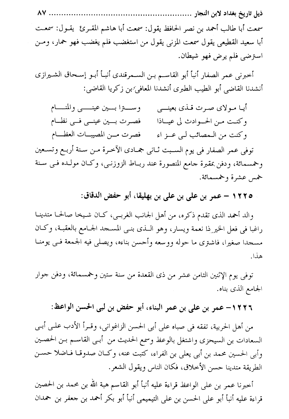 أخبرنى عمر الصفار أنبأ أبو القاسم بن السمرقندي أنبأ أبو إسحاق الشيرازي أنشدنا القاضي أبو الطيب الطبري أنشدنا المعافى بن زكريا القاضي: