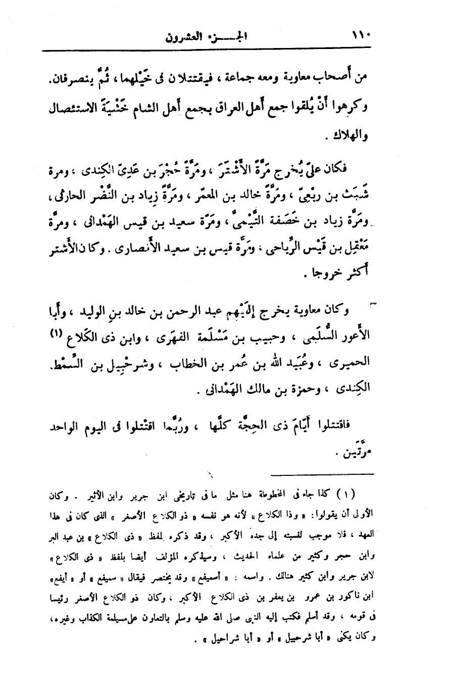 [1] كذا جاء فى المخطوطة هنا مثل ما فى تاريخى ابن جرير وابن الأثير، وكان الأولى أن يقولوا: «وذا الكلاع» لأنه هو نفسه «ذو الكلاع الأصغر» الذى كان فى هذا العهد، فلا موجب لنسبته إلى جده الأكبر، وقد ذكره لفظ «ذى الكلاع» بن عبد البر وابن حجر وكثير من علماء الحديث، وسيذكره المؤلف أيضا بلفظ «ذى الكلاع» لابن جرير وابن كثير هنا لك. واسمه: «أسميفع» وقد يختصر فيقال «سميفع» أو «أيفع» ابن ناكور بن عمرو بن يعفر بن ذى الكلاع الأكبر، وكان ذو الكلاع الأصغر رئيسا فى قومه، وقد أسلم فكتب إليه النبى صلى الله عليه وسلم بالتعاون على مسيلمة الكذاب وغيره، وكان يكنى «أبا شرحبيل» أو «أبا شراحيل» .