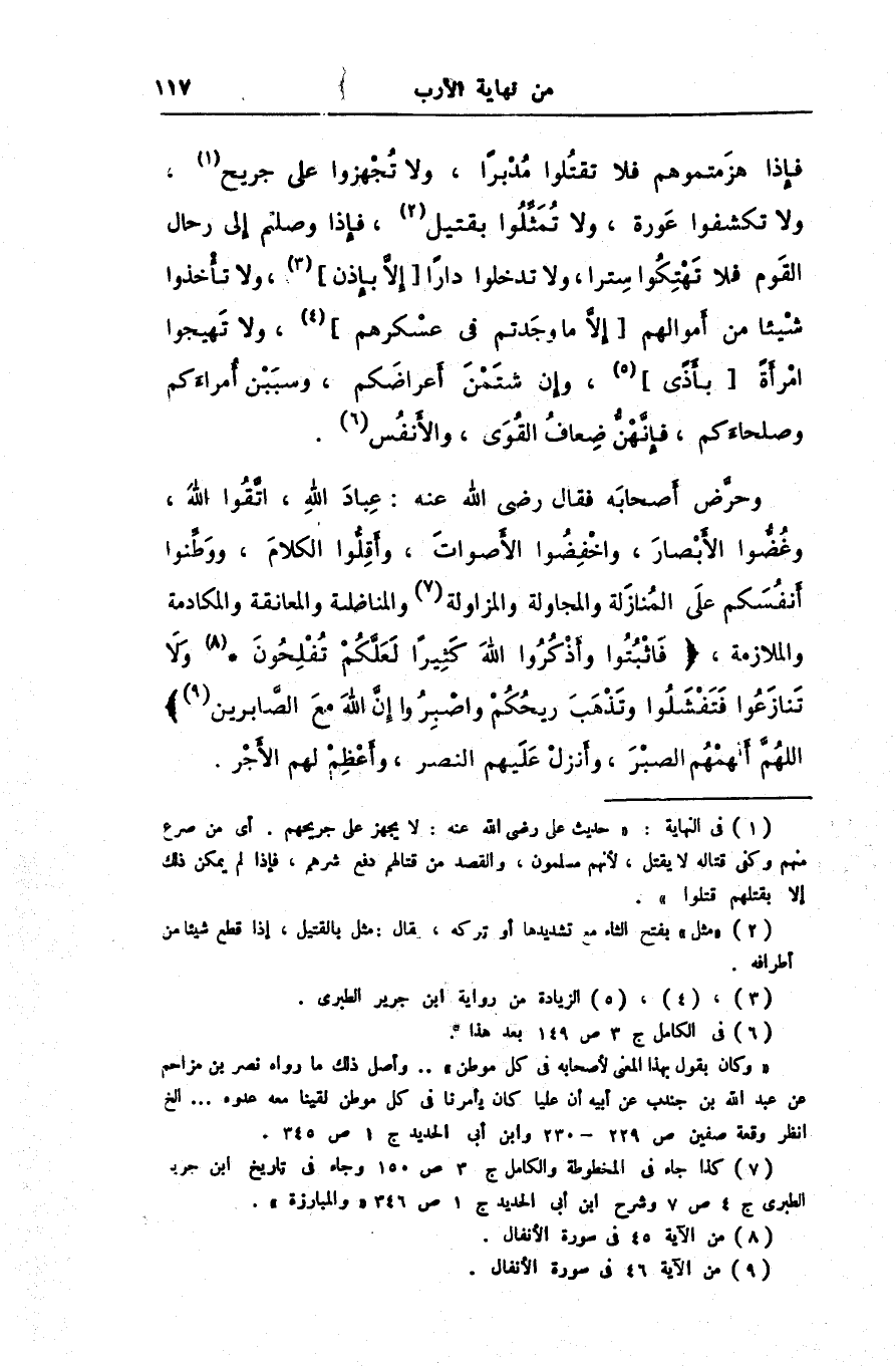 فإذا هزمتموهم فلا تقتلوا مدبرا، ولا تجهزوا على جريح [1] ، ولا تكشفوا عورة، ولا تمثّلوا بقتيل [2] ، فإذا وصلتم إلى رحال القوم فلا تهتكوا سترا، ولا تدخلوا دارا [إلّا بإذن] [3] ، ولا تأخذوا شيئا من أموالهم [إلّا ما وجدتم فى عسكرهم] [4] ، ولا تهيجوا امرأة [بأذى] [5] ، وإن شتمن أعراضكم، وسببن أمراءكم وصلحاءكم، فإنّهنّ ضعاف القوى، والأنفس [6] .