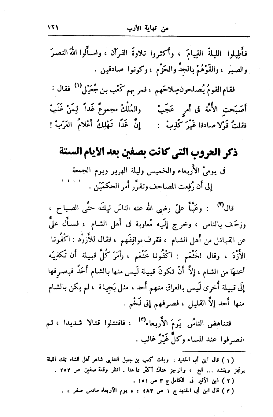 ذكر الحروب التى كانت بصفين بعد الأيام الستة فى يومى الأربعاء والخميس وليلة الهرير ويوم الجمعة إلى أن رفعت المصاحف وتقرّر أمر الحكمين.