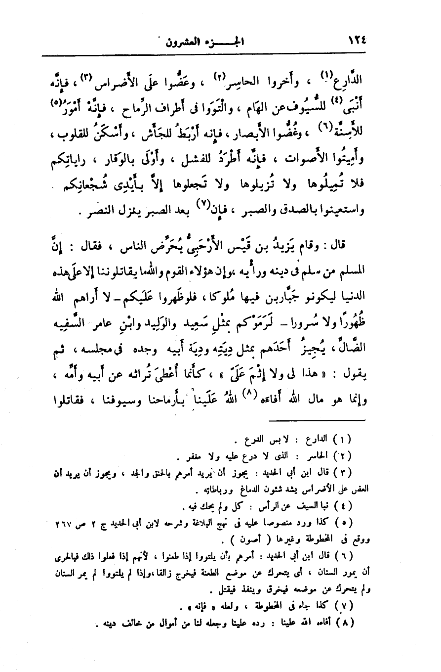 قال: وقام يزيد بن قيس الأرحبىّ يحرّض الناس، فقال: إنّ المسلم من سلم فى دينه ورأيه، وإن هؤلاء القوم والله ما يقاتلوننا إلا على هذه الدنيا ليكونو جبّارين فيها ملوكا، فلو ظهروا عليكم- لا أراهم الله ظهورا ولا سرورا- لرموكم بمثل سعيد والوليد وابن عامر السّفيه الضّالّ، يجيز أحدهم بمثل ديته ودية أبيه وجده فى مجلسه، ثم يقول: «هذا لى ولا إثم علىّ» ، كأنما أعطى تراثه عن أبيه وأمّه، وإنما هو مال الله أفاءه [8] الله علينا بأرماحنا وسيوفنا، فقاتلوا