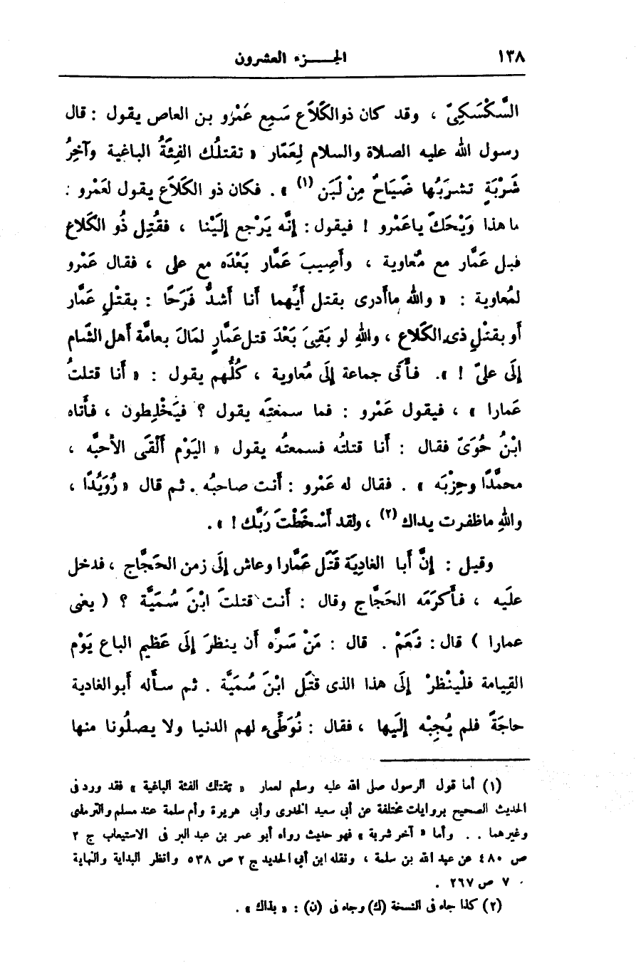ما هذا ويحك يا عمرو! فيقول: إنّه يرجع إلينا، فقتل ذو الكلاع قبل عمّار مع معاوية، وأصيب عمّار بعده مع على، فقال عمرو لمعاوية: «والله ما أدرى بقتل أيّهما أنا أشدّ فرحا: بقتل عمّار أو بقتل ذى الكلاع، والله لو بقى بعد قتل عمّار لمال بعامّة أهل الشّام إلى علىّ!» . فأتى جماعة إلى معاوية، كلّهم يقول: «أنا قتلت عمارا» ، فيقول عمرو: فما سمعته يقول؟ فيخلطون، فأتاه ابن حوىّ فقال: أنا قتلته فسمعته يقول «اليوم ألقى الأحبّه، محمّدا وحزبه» . فقال له عمرو: أنت صاحبه. ثم قال «رويدا، والله ما ظفرت يداك [2] ، ولقد أسخطت ربّك!» .