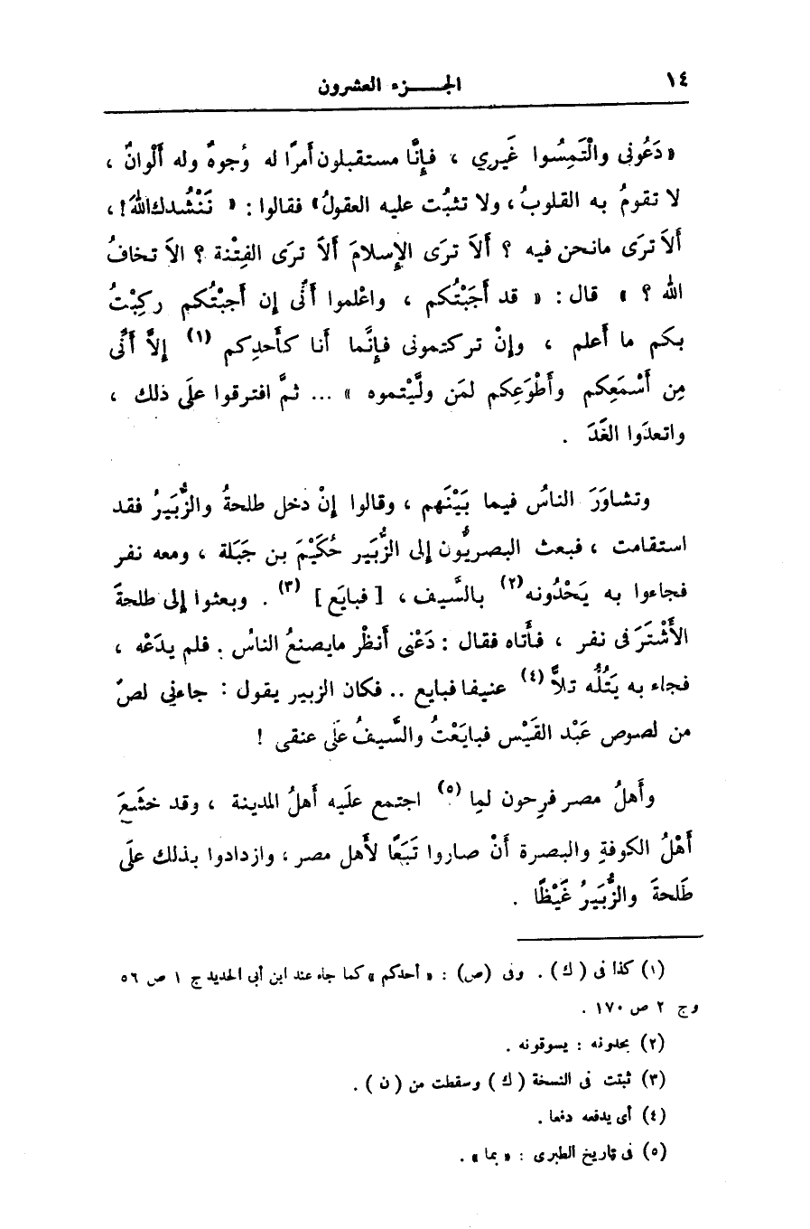 وتشاور الناس فيما بينهم، وقالوا إن دخل طلحة والزّبير فقد استقامت، فبعث البصريّون إلى الزّبير حكيم بن جبلة، ومعه نفر فجاءوا به يحدونه [2] بالسّيف، [فبايع] [3] . وبعثوا إلى طلحة الأشتر فى نفر، فأتاه فقال: دعنى أنظر ما يصنع الناس. فلم يدعه، فجاء به يتلّه تلّا [4] عنيفا فبايع.. فكان الزبير يقول: جاءنى لصّ من لصوص عبد القيس فبايعت والسّيف على عنقى! وأهل مصر فرحون لما [5] اجتمع عليه أهل المدينة، وقد خشع أهل الكوفة والبصرة أن صاروا تبعا لأهل مصر، وازدادوا بذلك على طلحة والزّبير غيظا.