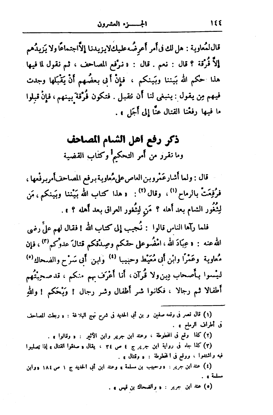 [1] قال نصر فى وقعة صفين وبن أبى الحديد فى شرح نهج البلاغة: «ربطت المصاحف فى أطراف الرماح» .