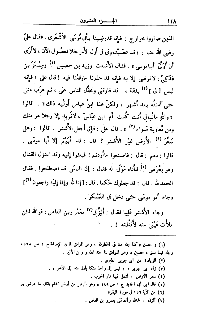 قالوا: نعم: قال: فاصنعوا ما أردتم! فبعثوا إليه وقد اعتزل القتال وهو بعرض [5] فأتاه مولى له فقال: إن الناس قد اصطلحوا. فقال الحمد لله. قال: قد جعلوك حكما. قال: [إنا لله وإنا إليه راجعون [6]] وجاء أبو موسى حتى دخل فى العسكر.