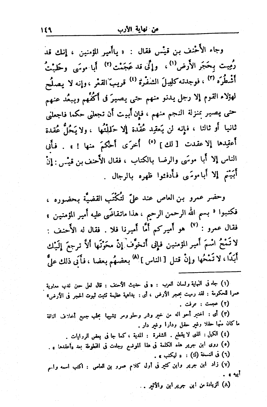 وجاء الأحنف بن قيس فقال: «يا أمير المؤمنين، إنك قد رميت بحجر الأرض [1] ، وإنّى قد عجمت [2] أبا موسى وحلبت أشطره [3] ، فوجدته كليل الشفرة [4] قريب القعر، وإنه لا يصلح لهؤلاء القوم إلا رجل يدنو منهم حتى يصير فى أكفّهم ويبعد عنهم حتى يصير بمنزلة النجم منهم، فإن أبيت أن تجعلنى حكما فاجعلنى ثانيا أو ثالثا، فإنه لن يعقد عقدة إلا حللتها، ولا يحلّ عقدة أعقدها إلا عقدت [لك] [5] أخرى أحكم منها!» . فأبى الناس إلا أبا موسى والرضا بالكتاب، فقال الأحنف بن قيس: إن أبيتم إلا أبا موسى فأدفئوا ظهره بالرجال.