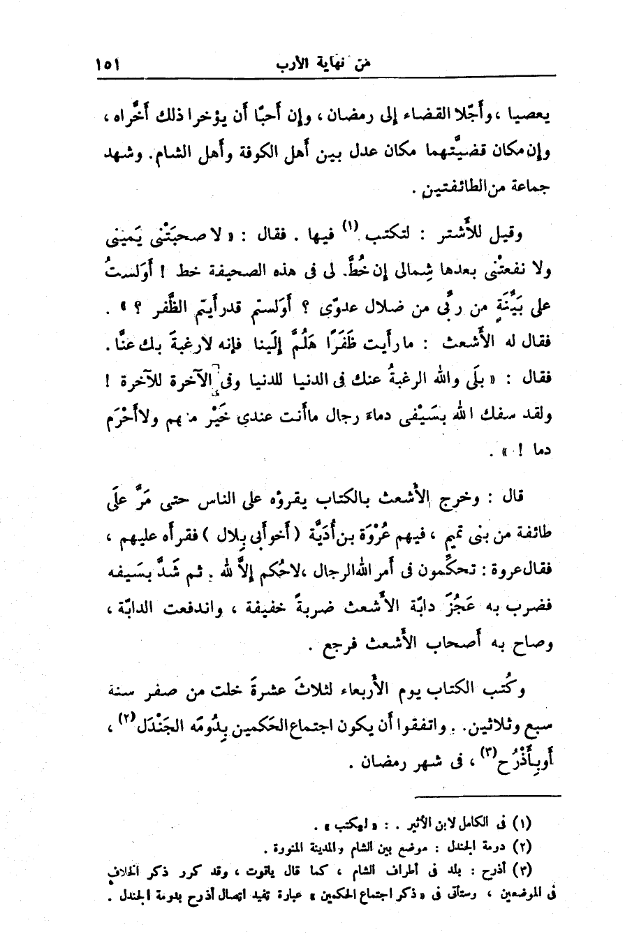 وكتب الكتاب يوم الأربعاء لثلاث عشرة خلت من صفر سنة سبع وثلاثين.. واتفقوا أن يكون اجتماع الحكمين بدومه الجندل [2] ، أو بأذرح [3] ، فى شهر رمضان.