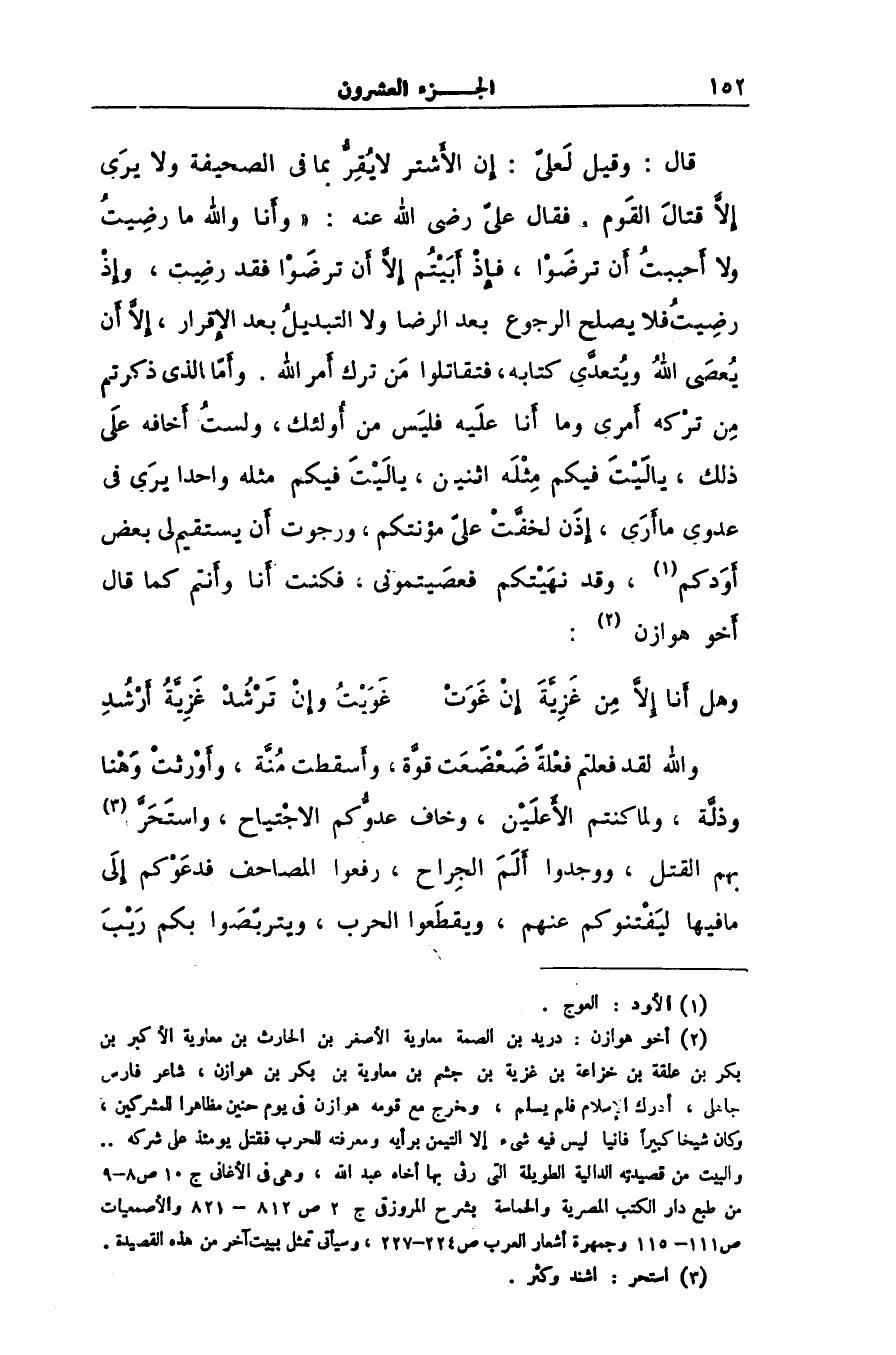 قال: وقيل لعلىّ: إن الأشتر لا يقرّ بما فى الصحيفة ولا يرى إلّا قتال القوم. فقال علىّ رضى الله عنه: «وأنا والله ما رضيت ولا أحببت أن ترضوا، فإذ أبيتم إلّا أن ترضوا فقد رضيت، وإذ رضيت فلا يصلح الرجوع بعد الرضا ولا التبديل بعد الإقرار، إلّا أن يعصى الله ويتعدّى كتابه، فتقاتلوا من ترك أمر الله. وأمّا الذى ذكرتم من تركه أمرى وما أنا عليه فليس من أولئك، ولست أخافه على ذلك، يا ليت فيكم مثله اثنين، يا ليت فيكم مثله واحدا يرى فى عدوى ما أرى، إذن لخفّت علىّ مؤنتكم، ورجوت أن يستقيم لى بعض أودكم [1] ، وقد نهيتكم فعصيتمونى، فكنت أنا وأنتم كما قال أخو هوازن [2] :