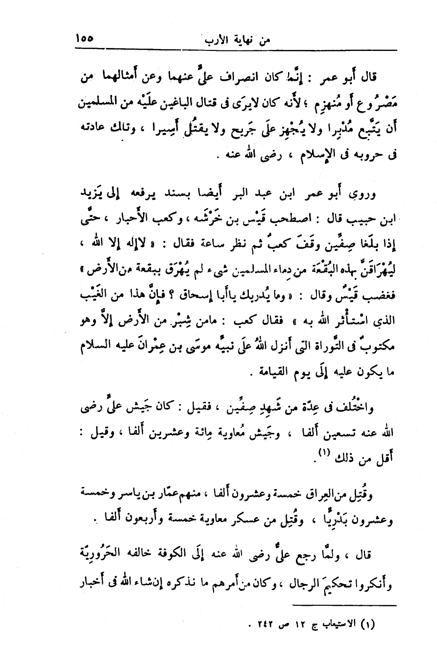 وروى أبو عمر ابن عبد البر أيضا بسند يرفعه إلى يزيد ابن حبيب قال: اصطحب قيس بن خرشه، وكعب الأحبار، حتّى إذا بلغا صفّين وقف كعب ثم نظر ساعة فقال: «لا إله إلا الله، ليهراقنّ بهذه البقعة من دماء المسلمين شىء لم يهرق ببقعة من الأرض» فغضب قيس وقال: «وما يدريك يا أبا إسحاق؟ فإنّ هذا من الغيب الذى استأثر الله به» فقال كعب: ما من شبر من الأرض إلّا وهو مكتوب فى التّوراة التى أنزل الله على نبيّه موسى بن عمران عليه السلام ما يكون عليه إلى يوم القيامة.
