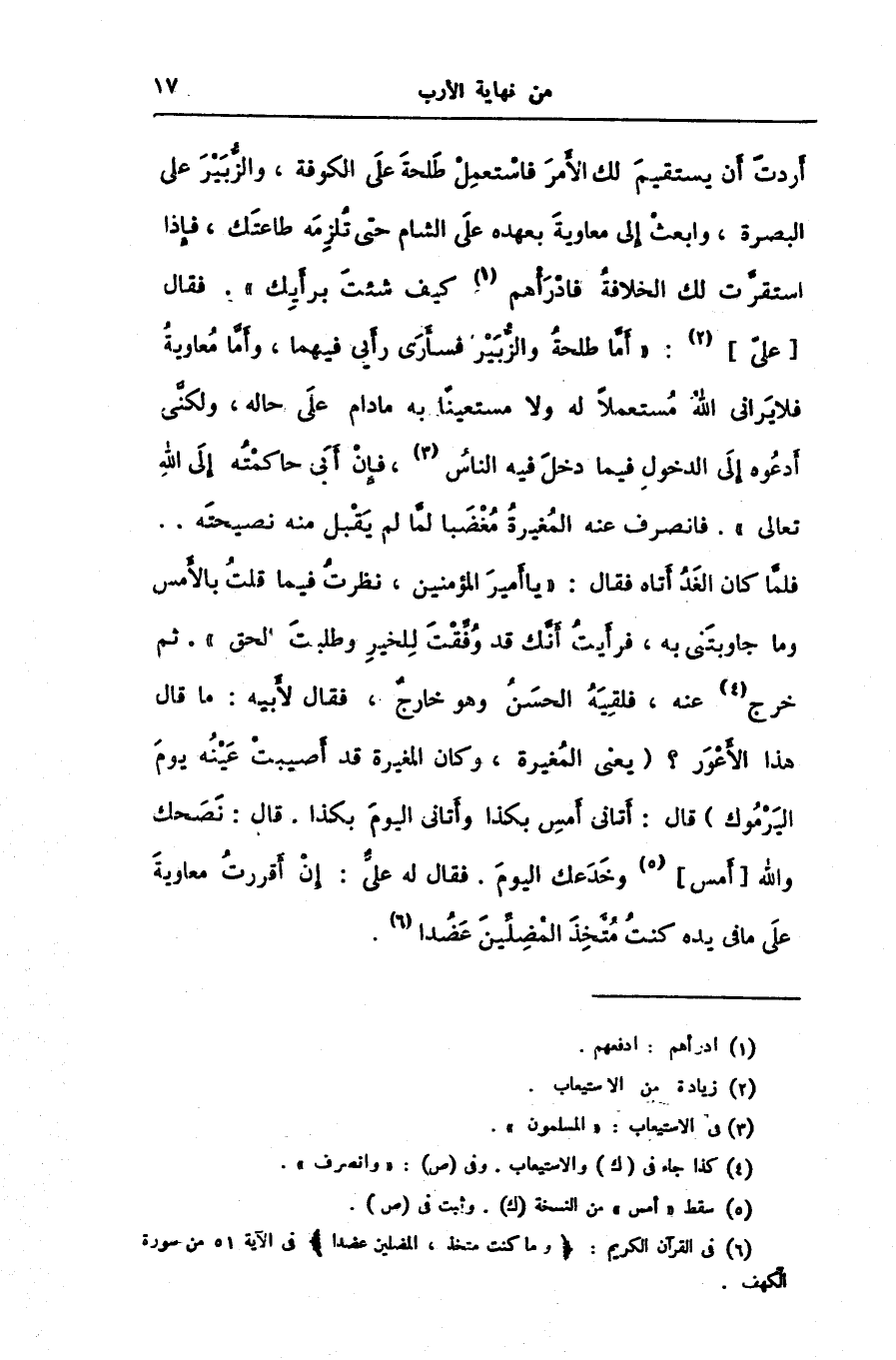 أردت أن يستقيم لك الأمر فاستعمل طلحة على الكوفة، والزّبير على البصرة، وابعث إلى معاوية بعهده على الشام حتى تلزمه طاعتك، فإذا استقرّت لك الخلافة فادرأهم [1] كيف شئت برأيك» . فقال [علىّ] [2] : «أمّا طلحة والزّبير فسأرى رأيى فيهما، وأمّا معاوية فلا يرانى الله مستعملا له ولا مستعينا به مادام على حاله، ولكنّى أدعوه إلى الدخول فيما دخل فيه الناس [3] ، فإن أبى حاكمته إلى الله تعالى» . فانصرف عنه المغيرة مغضبا لمّا لم يقبل منه نصيحته..