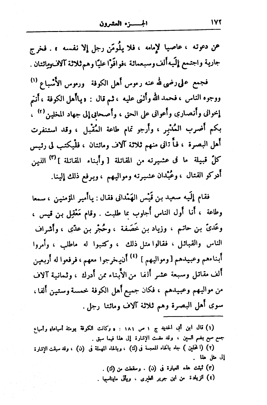فقام إليه سعيد بن قيس الهمدانى فقال: يا أمير المؤمنين، سمعا وطاعة، أنا أول الناس أجاوب بما طلبت. وقام معقل بن قيس، وعدىّ بن حاتم، وزياد بن خصفة، وحجر بن عدّى، وأشراف الناس والقبائل، فقالوا متل ذلك، وكتبوا له ما طلب، وأمروا أبناءهم وعبيدهم [ومواليهم] [4] أن يخرجوا معهم، فرفعوا له أربعين ألف مقاتل وسبعة عشر ألفا من الأبناء ممن أدرك، وثمانية آلاف من مواليهم وعبيدهم، فكان جميع أهل الكوفة خمسة وستين ألفا، سوى أهل البصرة وهم ثلاثة آلاف ومائتا رجل.