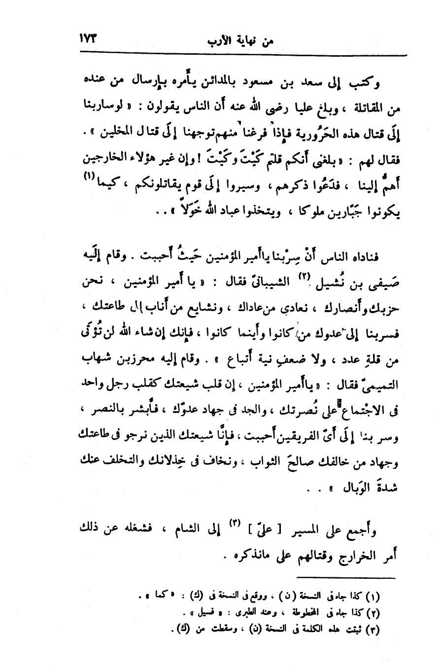 فناداه الناس أن سربنا يا أمير المؤمنين حيث أحببت. وقام إليه صيفى بن نشيل [2] الشيبانىّ فقال: «يا أمير المؤمنين، نحن حزبك وأنصارك، نعادى من عاداك، ونشايع من أناب إلى طاعتك، فسربنا إلى عدوك من كانوا وأينما كانوا، فإنك إن شاء الله لن تؤتى من قلة عدد، ولا ضعف نية أتباع» . وقام إليه محرز بن شهاب التميمىّ فقال: «يا أمير المؤمنين، إن قلب شيعتك كقلب رجل واحد فى الاجتماع على نصرتك، والجد فى جهاد عدوّك، فأبشر بالنصر، وسربنا إلى أىّ الفريقين أحببت، فإنّا شيعتك الذين نرجو فى طاعتك وجهاد من خالفك صالح الثواب، ونخاف فى خذلانك والتخلف عنك شدة الوبال» ..