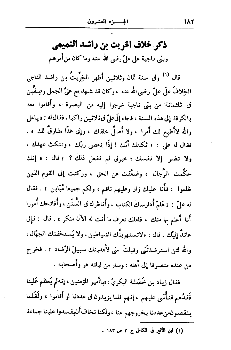 فقال له على: «ثكلتك أمّك! إذا تعصى ربّك، وتنكث عهدك، ولا تضر إلا نفسك؛ خبرنى لم تفعل ذلك؟» قال: «إنك حكّمت الرّجال، وضعفت عن الحق، وركنت إلى القوم الذين ظلموا، فأنا عليك زار وعليهم ناقم، ولكم جميعا مباين» . فقال له علىّ: «هلمّ أدارسك الكتاب، وأناظرك فى السّنن، وأفاتحك أمورا أنا أعلم بها منك، فلعلك تعرف ما أنت له الآن منكر» . قال: فإنى عائد إليك. قال: «لا تستهوينّك الشياطين، ولا يستخفنك الجهّال، والله لئن استرشدتنى وقبلت منى لأهدينك سبيل الرّشاد» . فخرج من عنده منصرفا إلى أهله، وسار من ليلته هو وأصحابه.