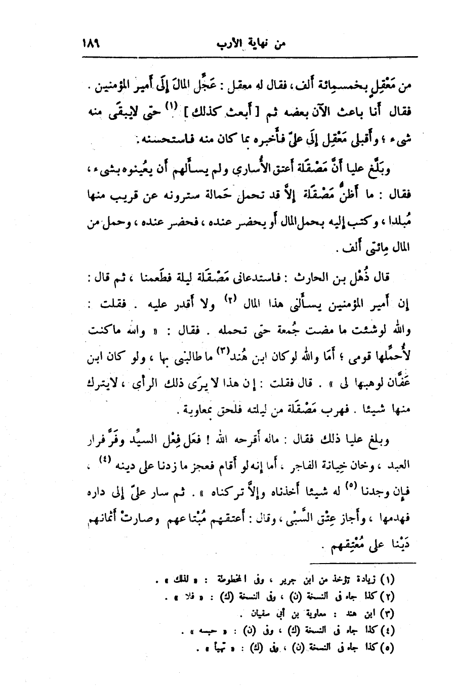 والله لو شئت ما مضت جمعة حتى تحمله. فقال: «والله ما كنت لأحمّلها قومى؛ أما والله لو كان ابن هند [3] ما طالبنى بها، ولو كان ابن عفّان لو هبها لى» . قال فقلت: إن هذا لا يرى ذلك الرأى، لا يترك منها شيئا. فهرب مصقلة من ليلته فلحق بمعاوية.