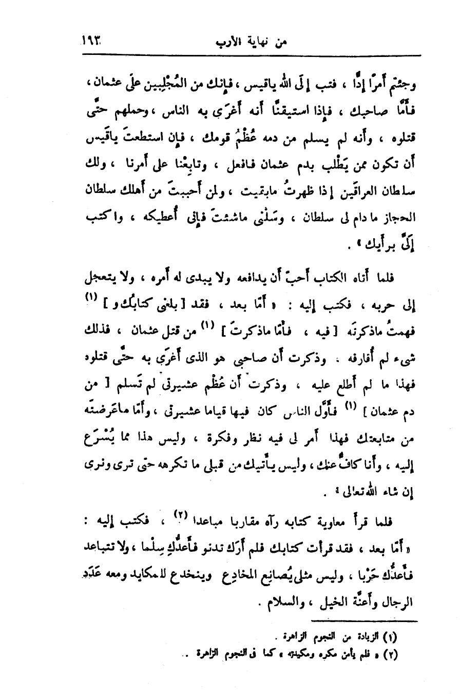وجئتم أمرا إدّا، فتب إلى الله يا قيس، فإنك من المجلبين على عثمان، فأمّا صاحبك، فإذا استيقنّا أنه أغرى به الناس، وحملهم حتّى قتلوه، وأنه لم يسلم من دمه عظم قومك، فإن استطعت يا قيس أن تكون ممن يطلب بدم عثمان فافعل، وتابعنا على أمرنا، ولك سلطان العراقين إذا ظهرت ما بقيت، ولمن أحببت من أهلك سلطان الحجاز ما دام لى سلطان، وسلنى ما شئت فإنى أعطيكه، واكتب إلىّ برأيك» .