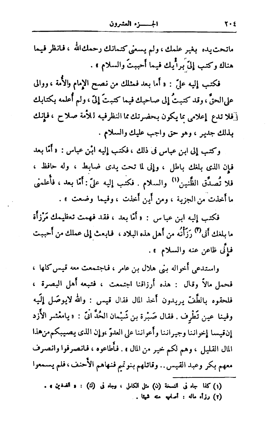 وكتب إلى ابن عباس فى ذلك، فكتب إليه ابن عباس: «أمّا بعد فإن الذى بلغك باطل، وإنى لما تحت يدى ضابط، وله حافظ، فلا تصدّق الظّنين [1] والسلام. فكتب إليه علىّ: أمّا بعد، فأعلمنى ما أخذت من الجزية، ومن أين أخذت، وفيما وضعت» .