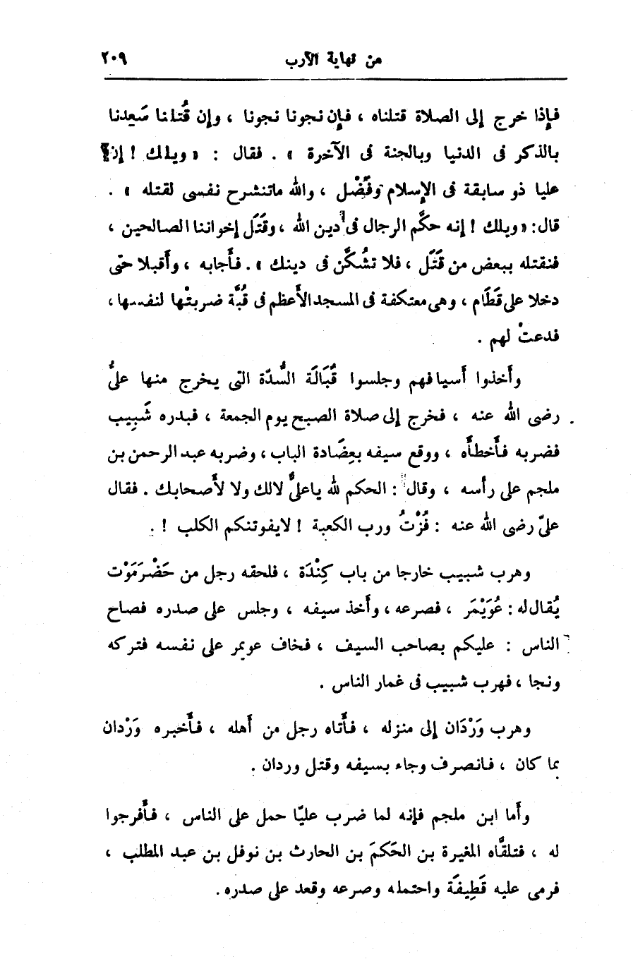 وأخذوا أسيافهم وجلسوا قبالة السّدّة التى يخرج منها علىّ رضى الله عنه، فخرج إلى صلاة الصبح يوم الجمعة، فبدره شبيب فضربه فأخطأه، ووقع سيفه بعضادة الباب، وضربه عبد الرحمن بن ملجم على رأسه، وقال: الحكم لله يا علىّ لا لك ولا لأصحابك. فقال علىّ رضى الله عنه: فزت ورب الكعبة! لا يفوتنكم الكلب!.