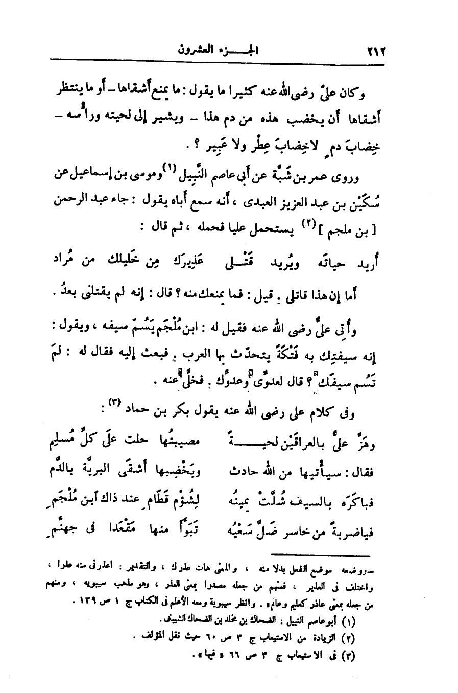 وروى عمر بن شبّة عن أبى عاصم النّبيل [1] وموسى بن إسماعيل عن سكين بن عبد العزيز العبدى، أنه سمع أباه يقول: جاء عبد الرحمن [بن ملجم] [2] يستحمل عليا فحمله، ثم قال: