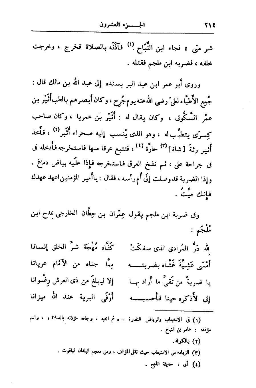 جمع الأطبّاء لعلىّ رضى الله عنه يوم جرح، وكان أبصرهم بالطب أثير بن عمر السّكّونى، وكان يقال له: أثير بن عمريا، وكان صاحب كسرى يتطبّب له، وهو الذى ينسب إليه صحراء أثير [2] ، فأخذ أثير رئة [شاة] [3] حارّة [4] ، فتتبع عرقا منها فاستخرجه فأدخله فى فى جراحة على، ثم نفخ العرق فاستخرجه فإذا عليه بياض دماغ.