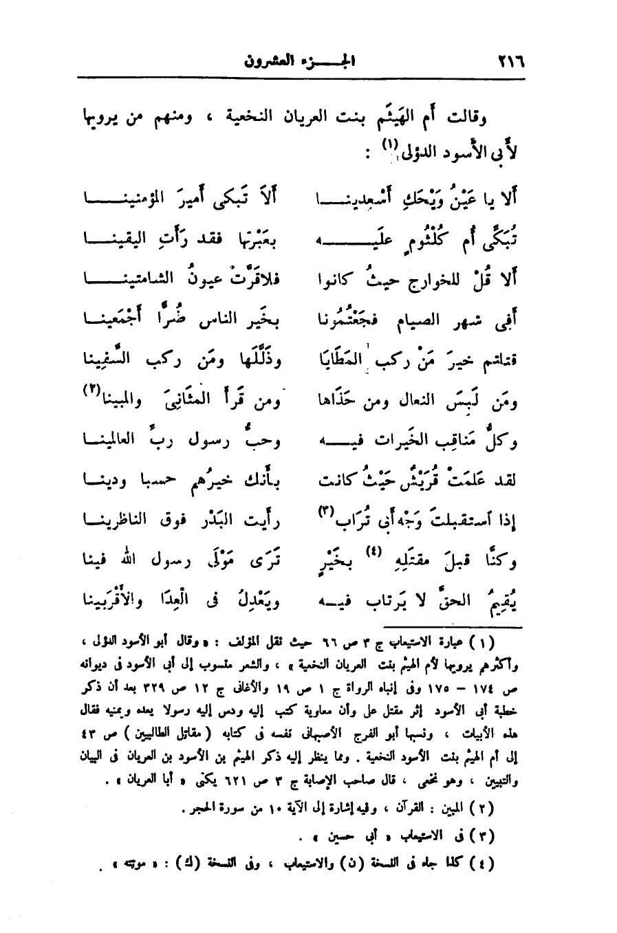 [1] عبارة الاستيعاب ج 3 ص 66 حيث نقل المؤلف: «وقال أبو الأسود الدؤلى، وأكثرهم يرويها لأم الهيثم بنت العريان النخعية» ، والشعر منسوب إلى أبى الأسود فى ديوانه ص 174- 175 وفى إنباه الرواة ج 1 ص 19 والأغانى ج 12 ص 329 بعد أن ذكر خطبة أبى الأسود إثر مقتل على وأن معاوية كتب إليه ودس إليه رسولا يعده ويمنيه فقال هذه الأبيات، ونسبها أبو الفرج الأصبهانى نفسه فى كتابه (مقاتل الطالبيين) ص 43 إلى أم الهيثم بنت الأسود النخعية. ومما ينظر إليه ذكر الهيثم بن الأسود بن العريان فى البيان والتبيين، وهو نخعى، قال صاحب الإصابة ج 3 ص 621 يكنى «أبا العريان» .