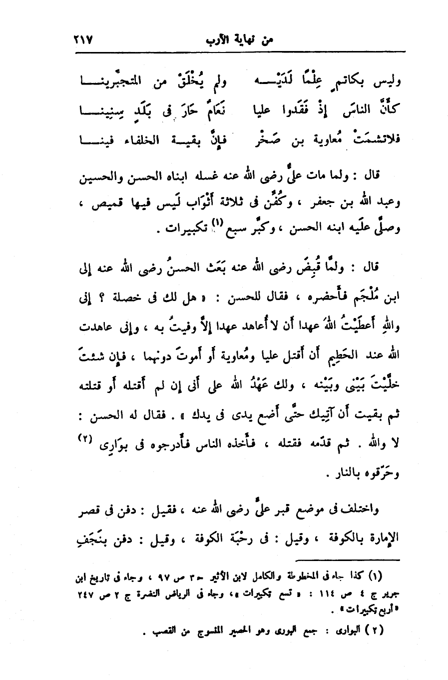 [1] كذا جاء فى المخطوطة والكامل لابن الأثير ح 3 ص 97، وجاء فى تاريخ ابن جرير ج 4 ص 114: «تسع تكبيرات» ، وجاء فى الرياض النضرة ج 2 ص 247 «أربع تكبيرات» .