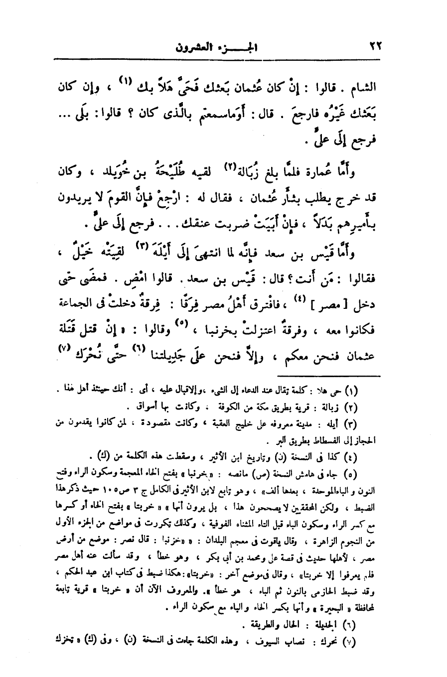 [5] جاء فى هامش النسخة (ص ما نصه: «خرنبا» بفتح الخاء المعجمة وسكون الراء وفتح النون والباء الموحدة، بعدها ألف» ، وهو تابع لابن الأثير فى الكامل ج 3 ص 105 حيث ذكر هذا الضبط، ولكن المحققين لا يصححون هذا، بل يرون أنها» «خربتا» بفتح الخاء أو كسرها مع كسر الراء وسكون الباء قبل التاء المثناه الفوفية، وكذلك تكررت فى مواضع من الجزء الأول من النجوم الزاهرة، وقال ياقوت فى معجم البلدان: « «خزنبا: قال نصر: موضع من أرض مصر، لأهلها حديث فى قصة على ومحمد بن أبى بكر، وهو خطأ، وقد سألت عنه أهل مصر فلم يعرفوا إلا خربتا» ، وقال فى موضع آخر: «خربتا» : هكذا ضبط فى كتاب ابن عبد الحكم، وقد ضبط الحازمى بالنون ثم الباء، هو خطأ» . والمعروف الآن أن «خربتا» قرية تابعة لمحافظة «البحيرة» وأنها بكسر الخاء والباء مع سكون الراء.