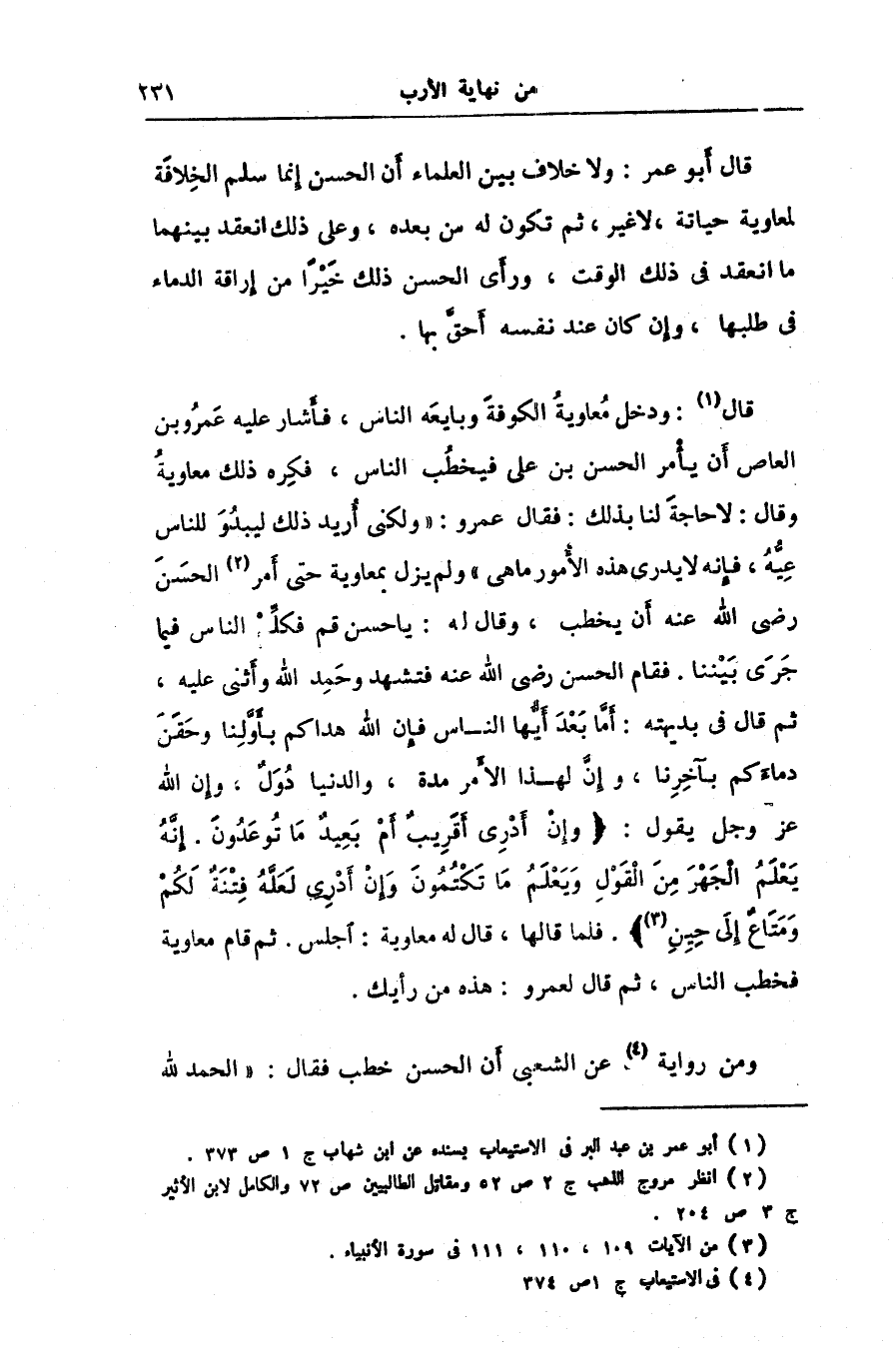 قال [1] : ودخل معاوية الكوفة وبايعه الناس، فأشار عليه عمرو بن العاص أن يأمر الحسن بن على فيخطب الناس، فكره ذلك معاوية وقال: لا حاجة لنا بذلك: فقال عمرو: «ولكنى أريد ذلك ليبدو للناس عيّه، فإنه لا يدرى هذه الأمور ما هى» ولم يزل بمعاوية حتى أمر [2] الحسن رضى الله عنه أن يخطب، وقال له: يا حسن قم فكلّم الناس فيما جرى بيننا. فقام الحسن رضى الله عنه فتشهد وحمد الله وأثنى عليه، ثم قال فى بديهته: أمّا بعد أيّها الناس فإن الله هداكم بأوّلنا وحقن دماءكم بآخرنا، وإنّ لهذا الأمر مدة، والدنيا دول، وإن الله عز وجل يقول: وَإِنْ أَدْرِي أَقَرِيبٌ أَمْ بَعِيدٌ ما تُوعَدُونَ. إِنَّهُ يَعْلَمُ الْجَهْرَ مِنَ الْقَوْلِ وَيَعْلَمُ ما تَكْتُمُونَ وَإِنْ أَدْرِي لَعَلَّهُ فِتْنَةٌ لَكُمْ وَمَتاعٌ إِلى حِينٍ
