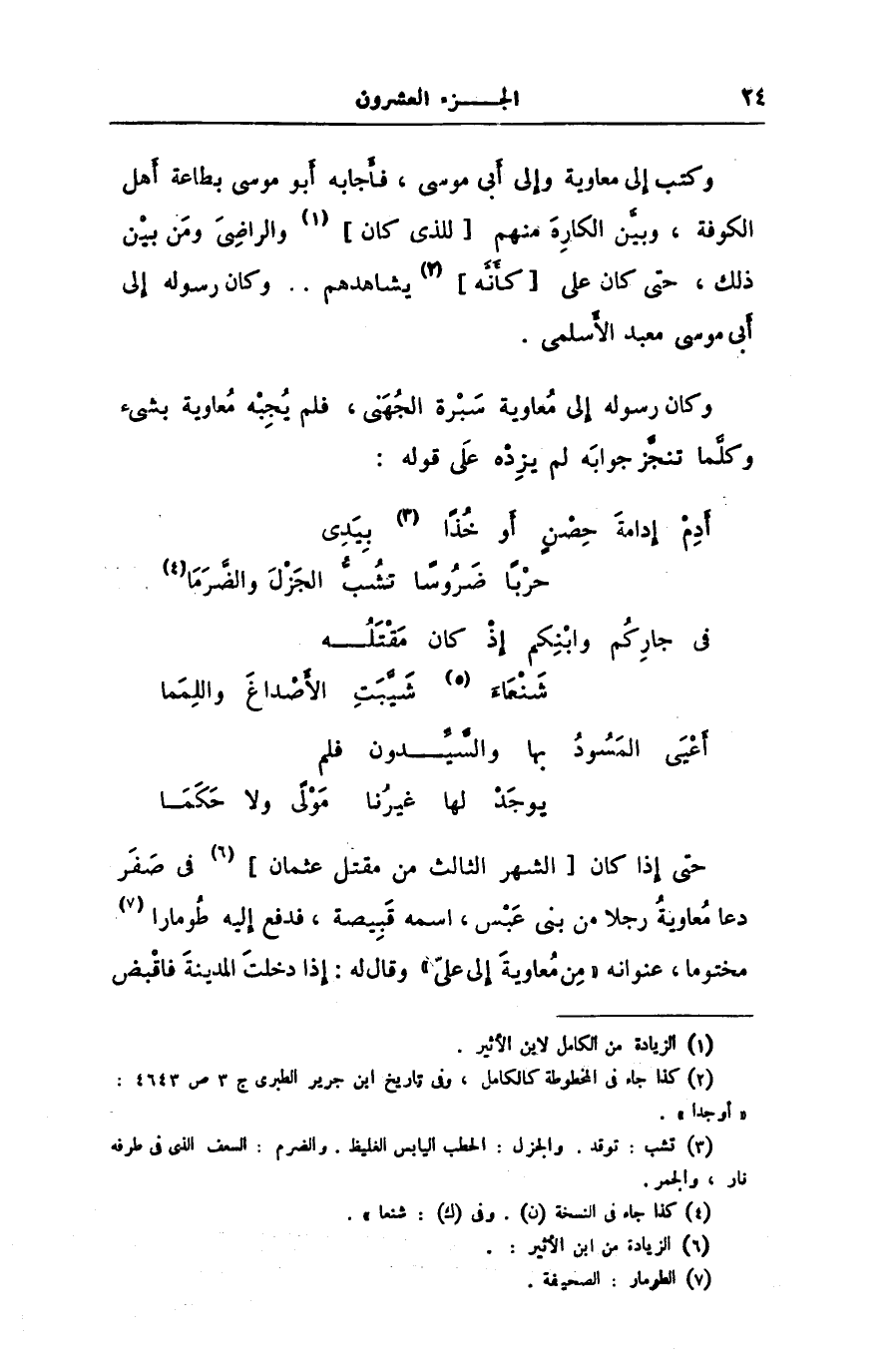 وكتب إلى معاوية وإلى أبى موسى، فأجابه أبو موسى بطاعة أهل الكوفة، وبيّن الكاره منهم [للذى كان] [1] والراضى ومن بين ذلك، حتى كان على [كأنّه] [2] يشاهدهم.. وكان رسوله إلى أبى موسى معبد الأسلمى.