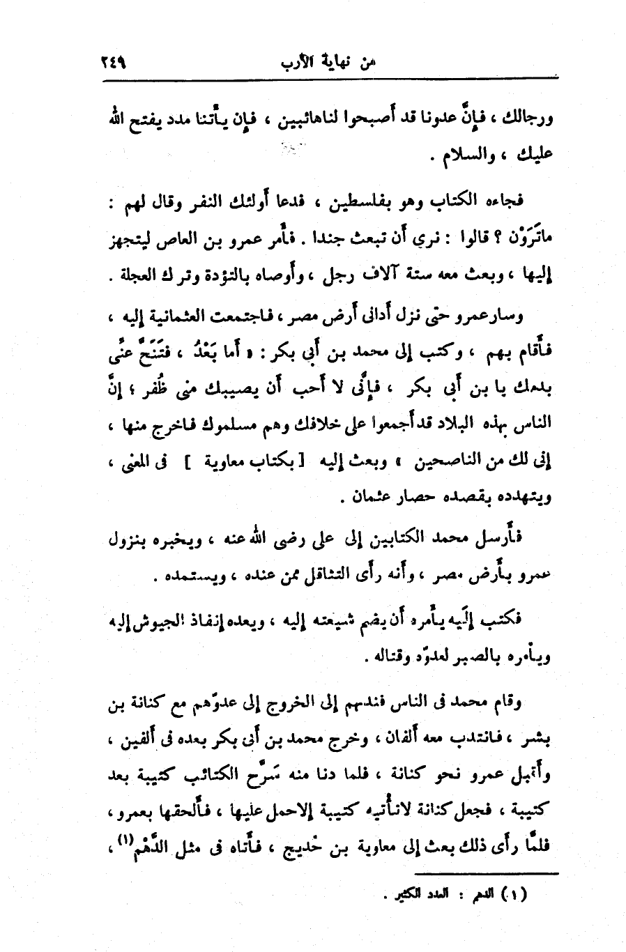 وسار عمرو حتى نزل أدانى أرض مصر، فاجتمعت العثمانية إليه، فأقام بهم، وكتب إلى محمد بن أبى بكر: «أما بعد، فتنحّ عنّى بدمك يا بن أبى بكر، فإنّى لا أحب أن يصيبك منى ظفر؛ إنّ الناس بهذه البلاد قد أجمعوا على خلافك وهم مسلموك فاخرج منها، إنى لك من الناصحين» وبعث إليه [بكتاب معاوية] فى المعنى، ويتهدده بقصده حصار عثمان.