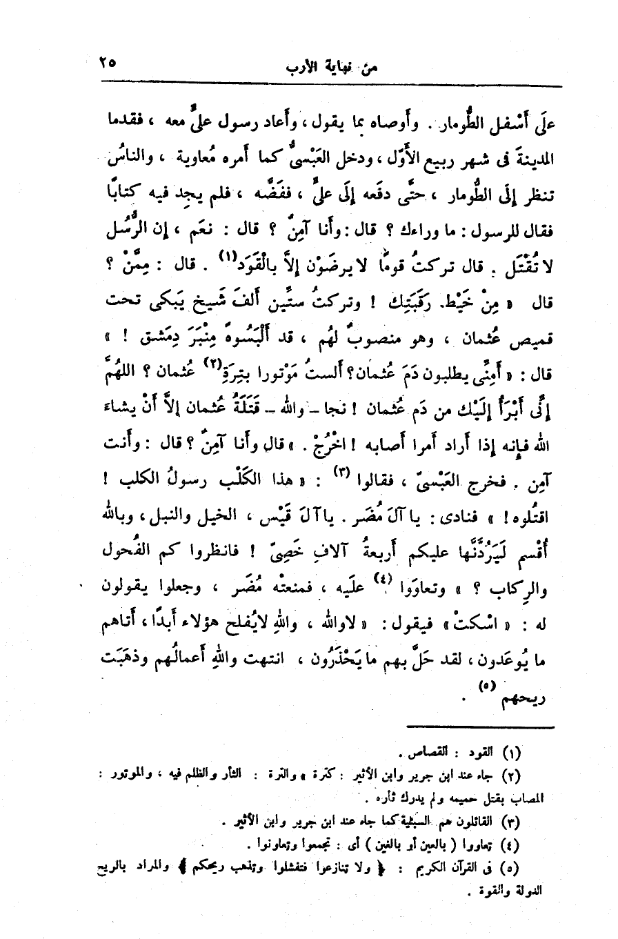 قال «من خيط رقبتك! وتركت ستّين ألف شيخ يبكى تحت قميص عثمان، وهو منصوب لهم، قد ألبسوه منبر دمشق!» قال: «أمنّى يطلبون دم عثمان؟ ألست موتورا بترة [2] عثمان؟ اللهمّ إنّى أبرأ إليك من دم عثمان! نجا- والله- قتلة عثمان إلّا أن يشاء الله فإنه إذا أراد أمرا أصابه! اخرج.» قال وأنا آمن؟ قال: وأنت آمن. فخرج العبسىّ، فقالوا [3] : «هذا الكلب رسول الكلب! اقتلوه!» فنادى: يا آل مضر. يا آل قيس، الخيل والنبل، وبالله أقسم ليردّنّها عليكم أربعة آلاف خصىّ! فانظروا كم الفحول والركاب؟» وتعاووا [4] عليه، فمنعته مضر، وجعلوا يقولون له: «اسكت» فيقول: «لا والله، والله لا يفلح هؤلاء أبدا، أتاهم ما يوعدون، لقد حلّ بهم ما يحذرون، انتهت والله أعمالهم وذهبت ريحهم [5] .