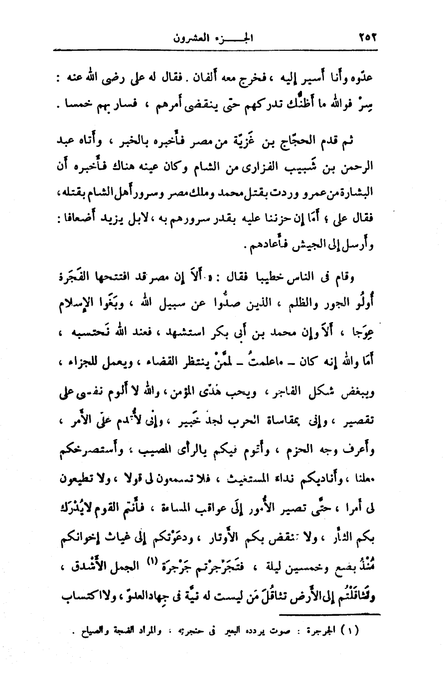 وقام فى الناس خطيبا فقال: «ألا إن مصر قد افتتحها الفجرة أولو الجور والظلم، الذين صدّوا عن سبيل الله، وبغوا الإسلام عوجا، ألا وإن محمد بن أبى بكر استشهد، فعند الله نحتسبه، أما والله إنه كان- ما علمت- لممّن ينتظر القضاء، ويعمل للجزاء، ويبغض شكل الفاجر، ويحب هدّى المؤمن، والله لا ألوم نفسى على تقصير، وإنى بمقاساة الحرب لجد خبير، وإنى لأقدم على الأمر، وأعرف وجه الحزم، وأقوم فيكم يا لرأى المصيب، وأستصرخكم معلنا، وأناديكم نداء المستغيث، فلا تسمعون لى قولا، ولا تطيعون لى أمرا، حتّى تصير الأمور إلى عواقب المساءة، فأنتم القوم لا يدرك بكم الثأر، ولا تنقض بكم الأوتار، ودعوتكم إلى غياث إخوانكم منذ بضع وخمسين ليلة، فتجرجرتم جرجرة [1] الجمل الأشدق، وتثاقلتم إلى الأرض تثاقل من ليست له نيّة فى جهاد العدوّ، ولا اكتساب