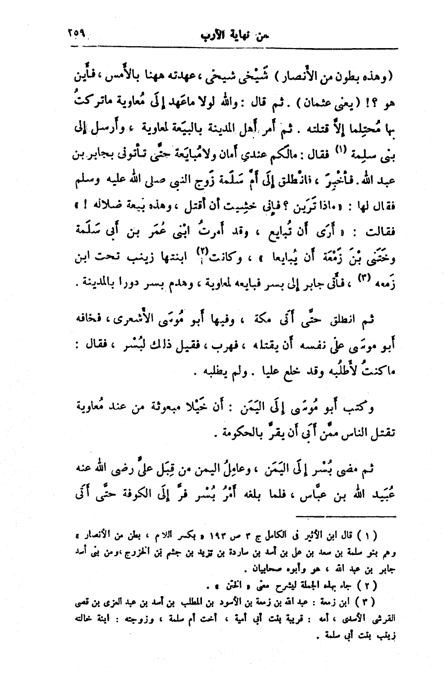 (وهذه بطون من الأنصار) شيخى شيخى، عهدته ههنا بالأمس، فأين هو؟! (يعنى عثمان) . ثم قال: والله لولا ما عهد إلى معاوية ما تركت بها محتلما إلّا قتلته. ثم أمر أهل المدينة بالبيعة لمعاوية، وأرسل إلى بنى سلمة [1] فقال: ما لكم عندى أمان ولا مبايعة حتّى تأتونى بجابر بن عبد الله. فأخبر، فانطلق إلى أمّ سلمة زوج النبى صلى الله عليه وسلم فقال لها: «ماذا ترين؟ فإنى خشيت أن أقتل، وهذه بيعة ضلاله!» فقالت: «أرى أن تبايع، وقد أمرت ابنى عمر بن أبى سلمة وختنى بن زمعة أن يبايعا» ، وكانت [2] ابنتها زينب تحت ابن زمعه [3] ، فأتى جابر إلى بسر فبايعه لمعاوية، وهدم بسر دورا بالمدينة.