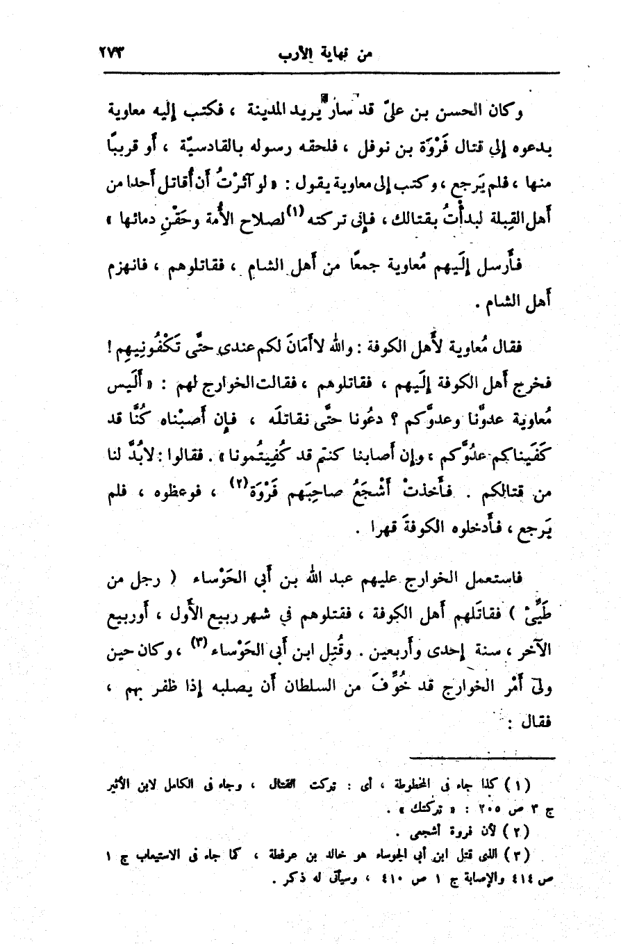 وكان الحسن بن علىّ قد سار يريد المدينة، فكتب إليه معاوية بدعوه إلى قتال فروة بن نوفل، فلحقه رسوله بالقادسيّة، أو قريبا منها، فلم يرجع، وكتب إلى معاوية يقول: «لو آثرت أن أقاتل أحدا من أهل القبلة لبدأت بقتالك، فإنى تركته [1] لصلاح الأمة وحقن دمائها» فأرسل إليهم معاوية جمعا من أهل الشام، فقاتلوهم، فانهزم أهل الشام.