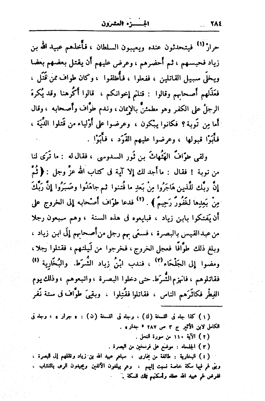 حرار [1] فيتحدثون عنده ويعيبون السلطان، فأخذهم عبيد الله بن زياد فحبسهم، ثم أحضرهم، وعرض عليهم أن يقتل بعضهم بعضا ويخلّى سبيل القاتلين، ففعلوا، فأطلقوا، وكان طواف ممن قتل، فعذلهم أصحابهم وقالوا: قتلتم إخوانكم، قالوا أكرهنا وقد يكره الرجل على الكفر وهو مطمئنّ بالإيمان، وندم طوّاف وأصحابه، وقال أما من توبة؟ فكانوا يبكون، وعرضوا على أولياء من قتلوا الدّية، فأبوا قبولها، وعرضوا عليهم القود، فأبوا.