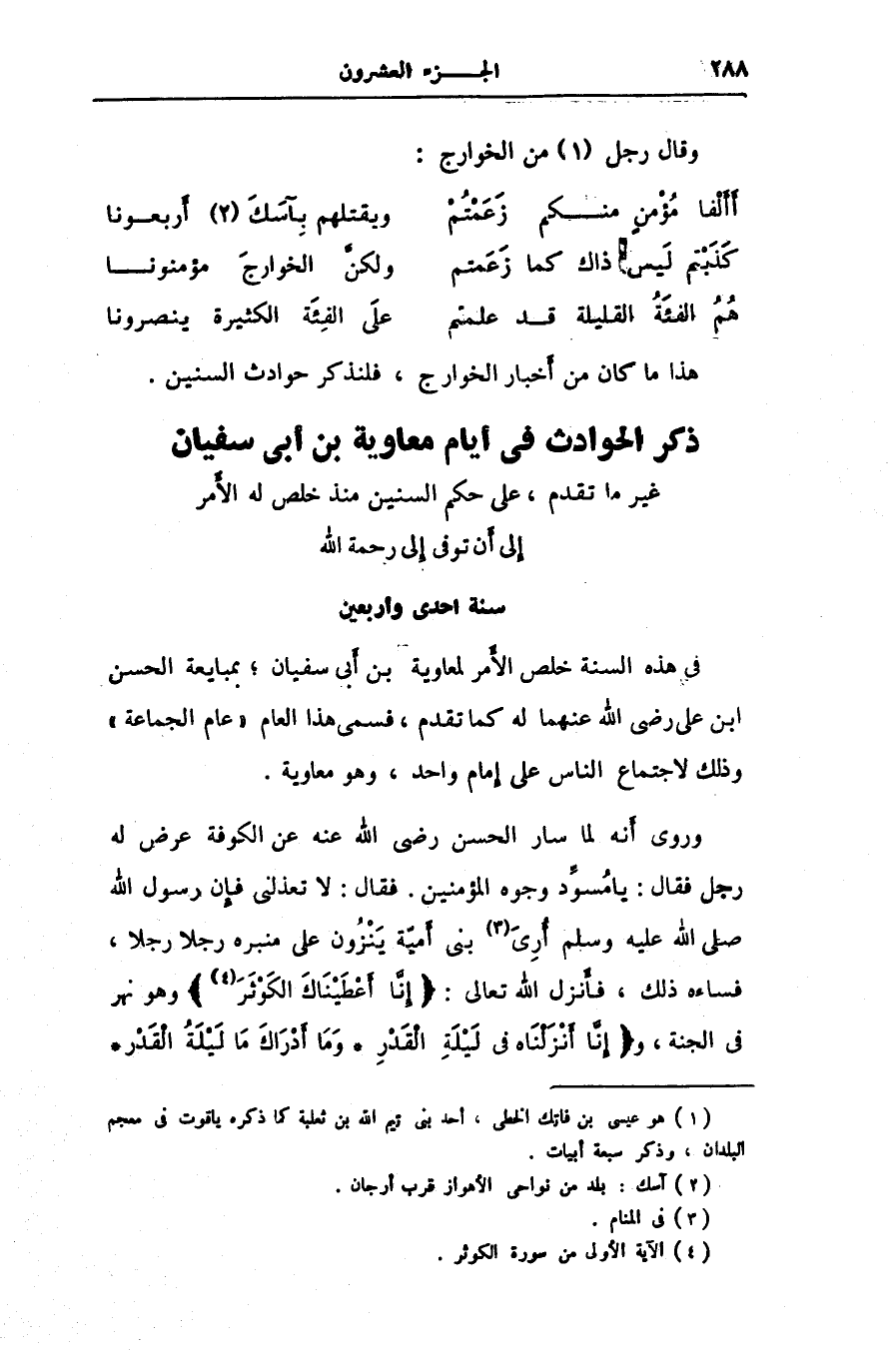 وروى أنه لما سار الحسن رضى الله عنه عن الكوفة عرض له رجل فقال: يا مسوّد وجوه المؤمنين. فقال: لا تعذلنى فإن رسول الله صلى الله عليه وسلم أرى [3] بنى أميّة ينزون على منبره رجلا رجلا، فساءه ذلك، فأنزل الله تعالى: إِنَّا أَعْطَيْناكَ الْكَوْثَرَ [4]