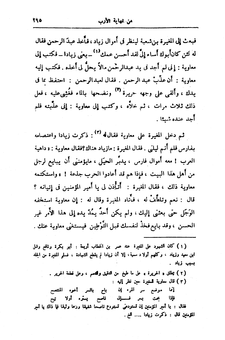 فبعث إلى المغيرة بن شعبة لينظر فى أموال زياد، فأخذ عبد الرحمن فقال له لئن كان أبوك أساء إلىّ لقد أحسن عمك [1]- يعنى زيادا- فكتب إلى معاوية: إنى لم أجد فى يد عبد الرحمن مالا يحلّ لى أخذه. فكتب إليه معاوية: أن عذّب عبد الرحمن. فقال لعبد الرحمن: احتفظ بما فى يدك، وألقى على وجهه حريرة [2] ونضحها بالماء فغشى عليه، فعل ذلك ثلاث مرات، ثم خلّاه، وكتب إلى معاوية: إنى عذّبته فلم أجد عنده شيئا.