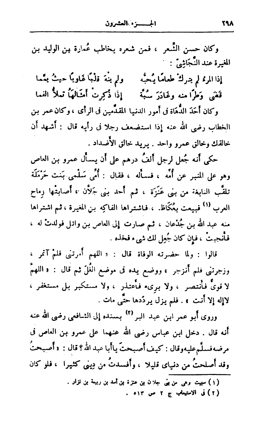 وروى أبو عمر ابن عبد البر [2] بسنده إلى الشافعى رضى الله عنه أنه قال. دخل ابن عباس رضى الله عنهما على عمرو بن العاص فى مرضه فسلّم عليه وقال: كيف أصبحت يا أبا عبد الله؟ قال: «أصبحت وقد أصلحت من دنياى قليلا، وأفسدت من دينى كثيرا، فلو كان