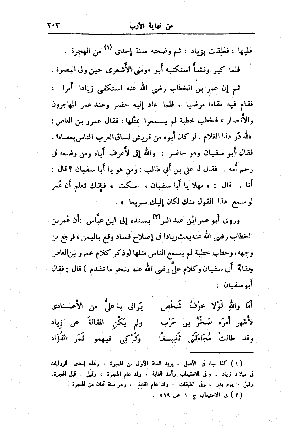 وروى أبو عمر ابن عبد البر [2] بسنده إلى ابن عبّاس: أن عمر بن الخطاب رضى الله عنه بعث زيادا فى إصلاح فساد وقع باليمن، فرجع من وجهه، وخطب خطبة لم يسمع الناس مثلها (وذكر كلام عمرو بن العاص ومقالة أبى سفيان وكلام علىّ رضى الله عنه بنحو ما تقدم) قال: فقال أبو سفيان: